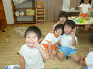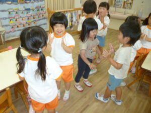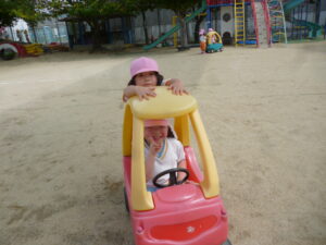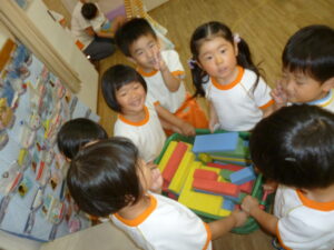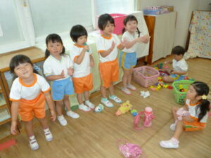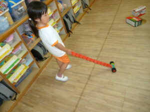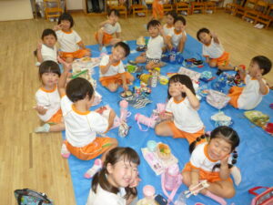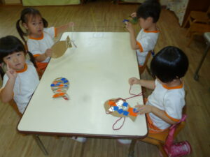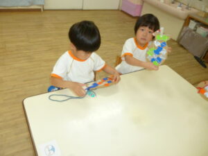 ペアでしたり、自由遊びの時間には先生と子ども役になって、子どもたちで楽しむ姿がたくさん見られています。
