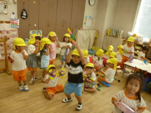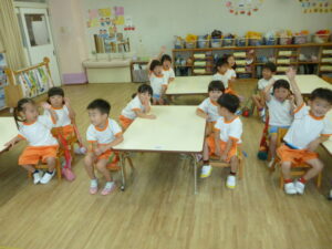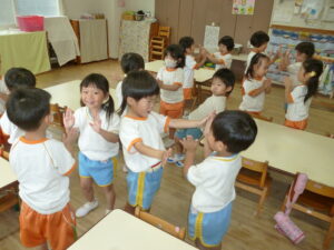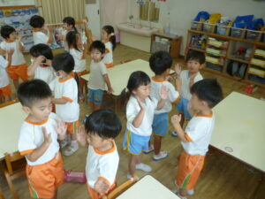 🎵トマト🎵の歌で三拍子リズム打ちをしています。