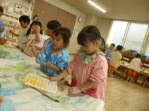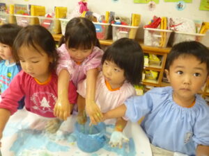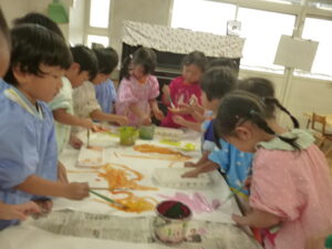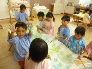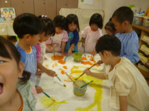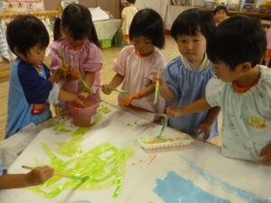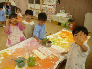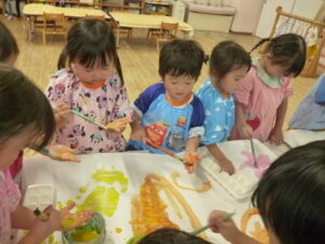 絵の具遊び🌟混色が好きで「こんな色になったよ~!」と子ども同士で発見を伝えあっていました😊