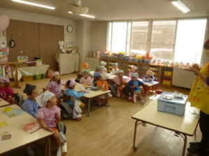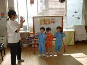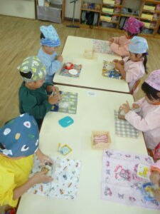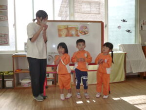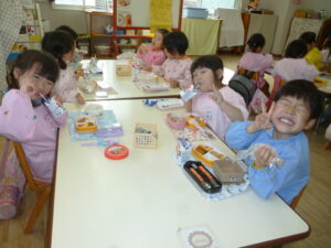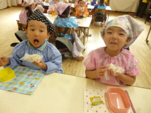 朝の会で、おにぎりの具は何が好きかという話しになると、「しゃけふれーく」「こんぶ」「うめぼし」といった声が上がりました。