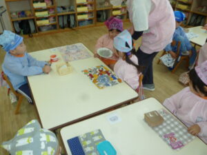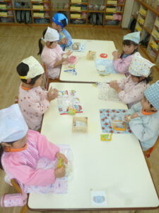 今日は、たまごふりかけとちりめんじゃこを入れることを伝えると「お魚好き💗」と言う子が多く、「カルシウムは骨が強くなるんだよ」と言うと、「いっぱい食べないとっ!」と張り切っていましたよ😄