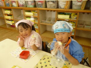 初めての食育は、給食のご飯でおにぎり作りをしました。