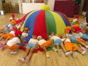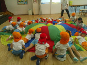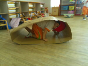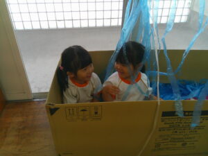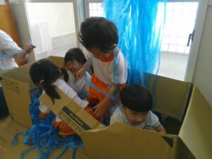室内では段ボールあそびを楽しんだり、ばら組さんとバルーン遊びをしたりしました😊