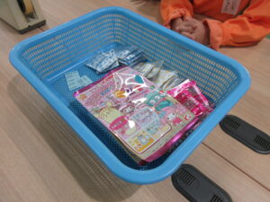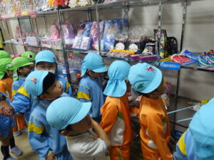 まずは、社内に入り、商品を見せてもらいました。色々なキャラクターのお菓子を見ることができて「プリキュアのお菓子や!ドラえもん!」などと大喜び❣️