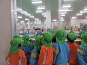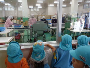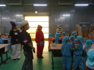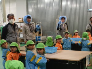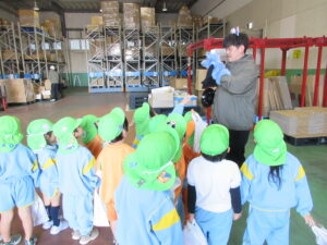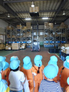 お菓子を保管している倉庫や袋詰めをしているところも見せてもらいました✨荷物が高く上がるフォークリフトや実際の袋詰めに興味津々の子どもたちでした😊