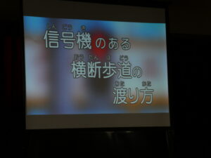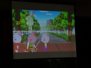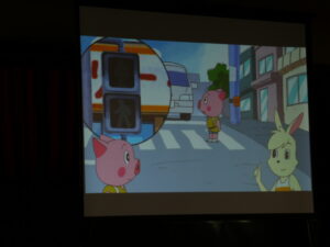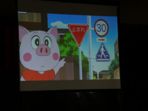 横断歩道や「歩行者横断禁止」などの道路標識にも意味があることを楽しいアニメで紹介してくれました。