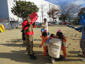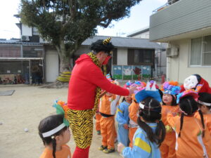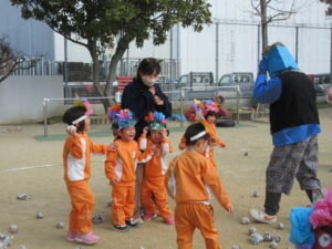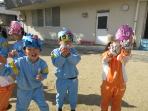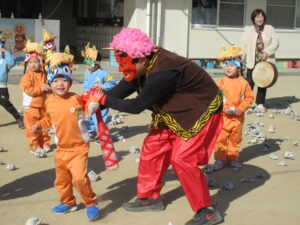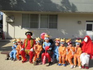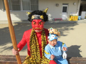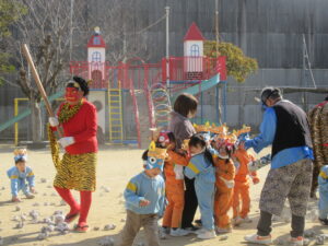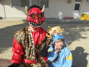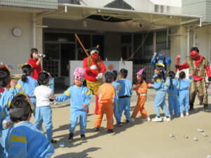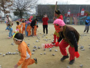 「おにはそと!ふくはうち!」と元気な声が園内に響き、子どもたちは笑顔いっぱい涙もいっぱいで豆まきを楽しみました。