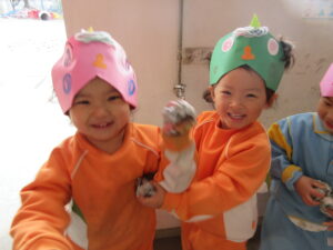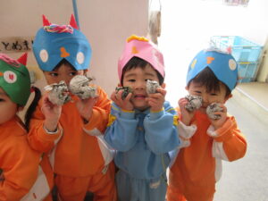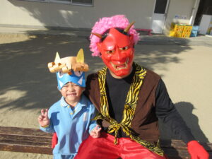 心の中の泣き虫鬼や怒りんぼ鬼を追い出し、みんなで一年の健康と幸せを願いました。