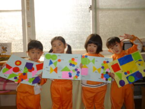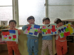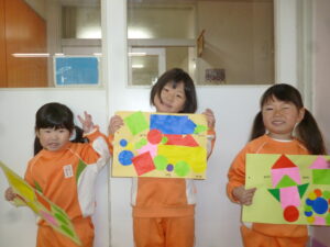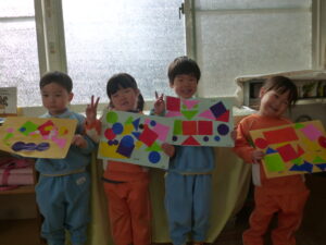 〇△▢を使って製作をしました。自分がイメージしたものを作れたね💗