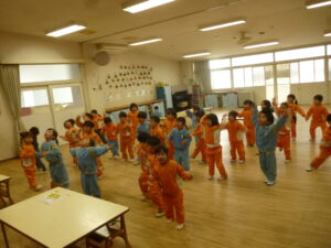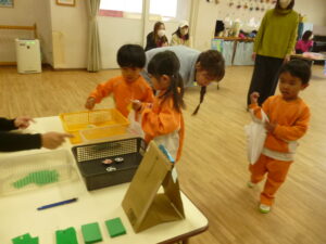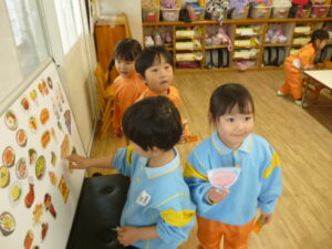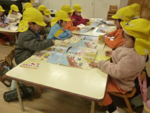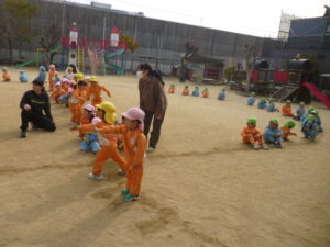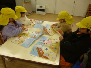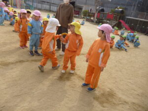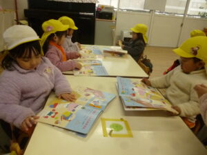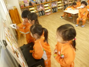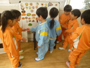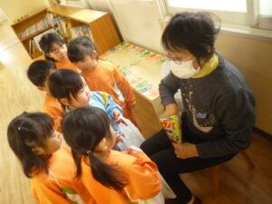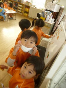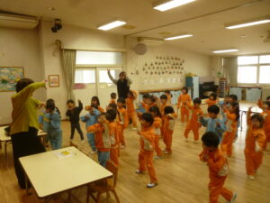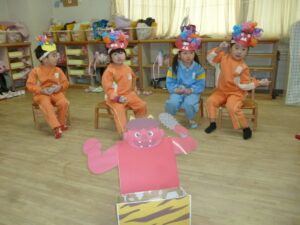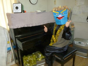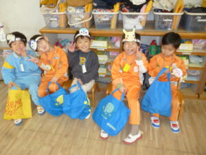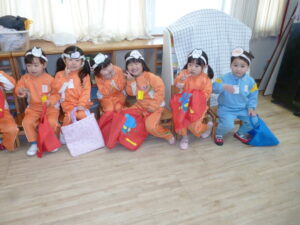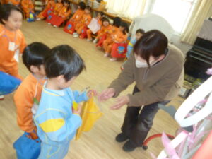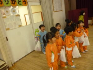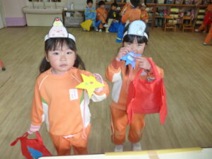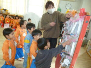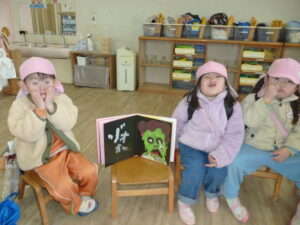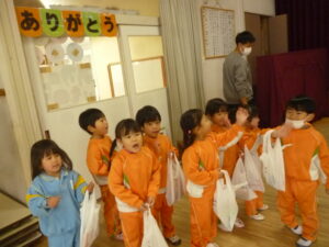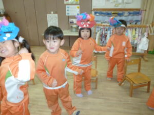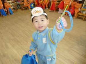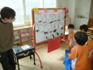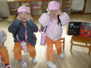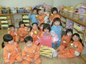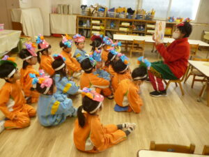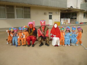 🌟節分祭当日は、みんなで作った金の豆でハイチーズ!豆まきの後、クラスに戻ると鬼さんがいたね。一緒にダンスもしました。帰りの会では絵本と同じ顔を真似っこして楽しみました。
