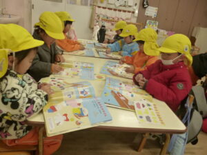 いとまきのうたを歌いながら、毛糸のシールを貼りました❄