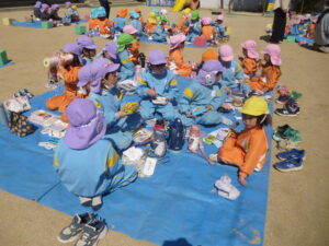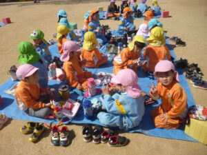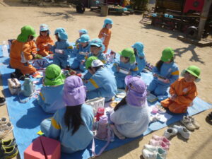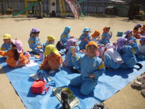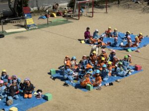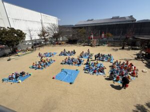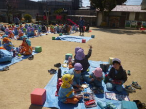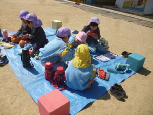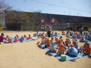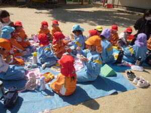 暖かい日が多くなってきたので、幼稚園のみんなでお弁当を持って、園庭に集合しました😄