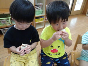 上手にスプーンですくって食べる子や、かぶりつく子も、、、
