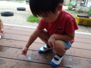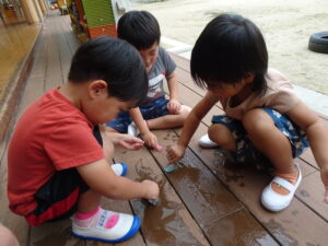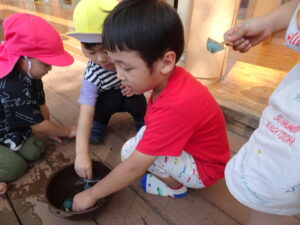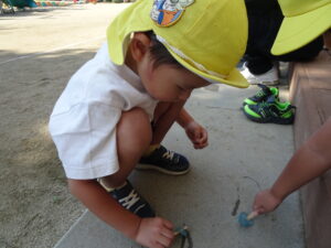 園庭でダンゴムシを探していると、、、