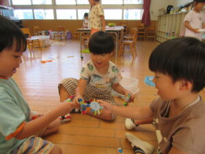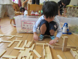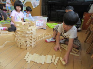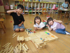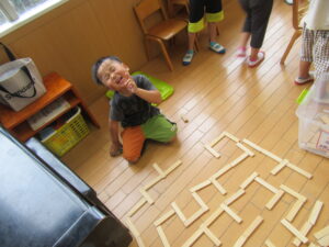 「駐車場作ったよ!」「迷路作ったよ!先生はゴールできる?」「天井まで届くタワーを作ろう!」